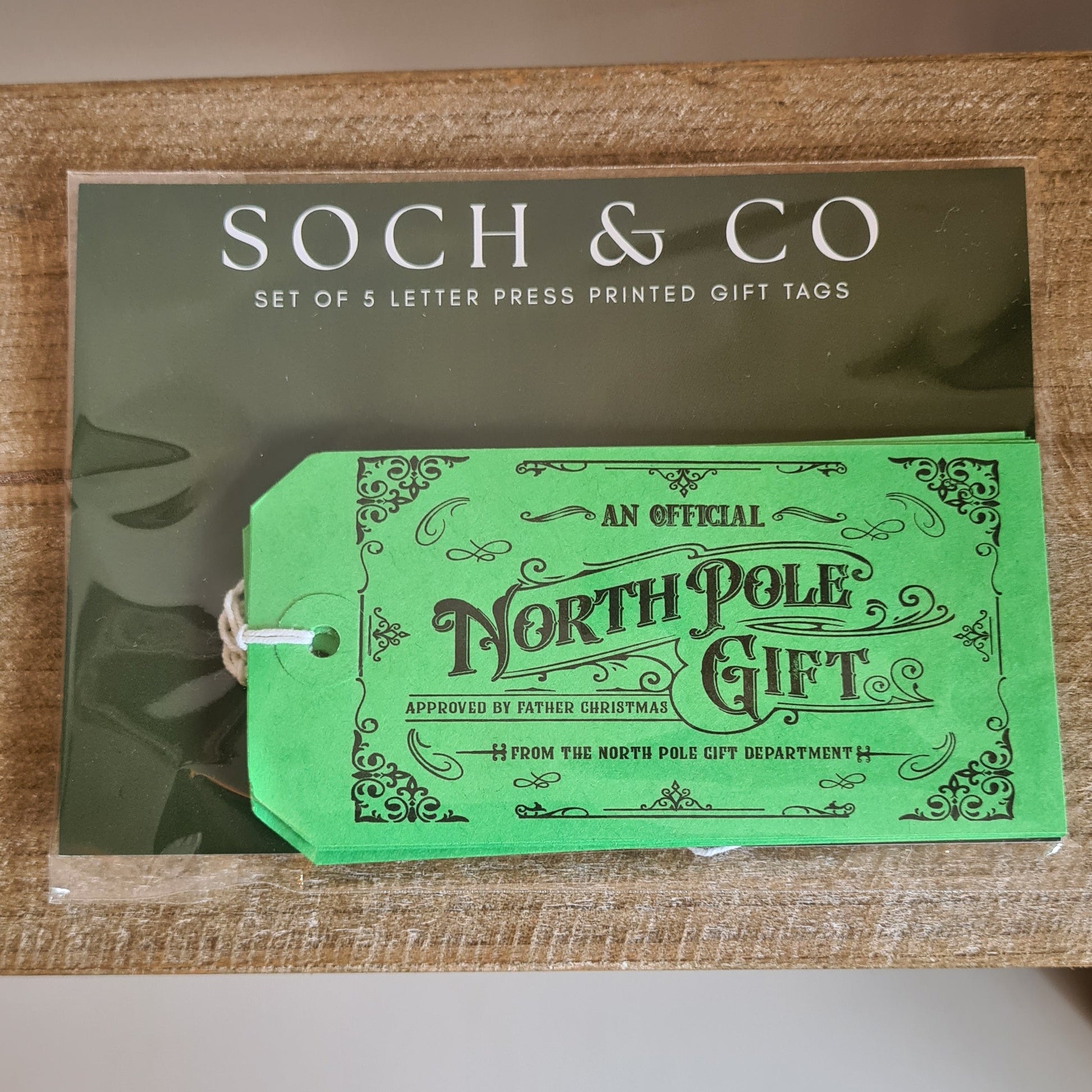 Pack of five Christmas Gift Tags for each of those super special gifts! Each tag is hand letter pressed and comes pre- strung for ease. Available in two designs: Official North Pole (green) and North Pole Delivery (pink).