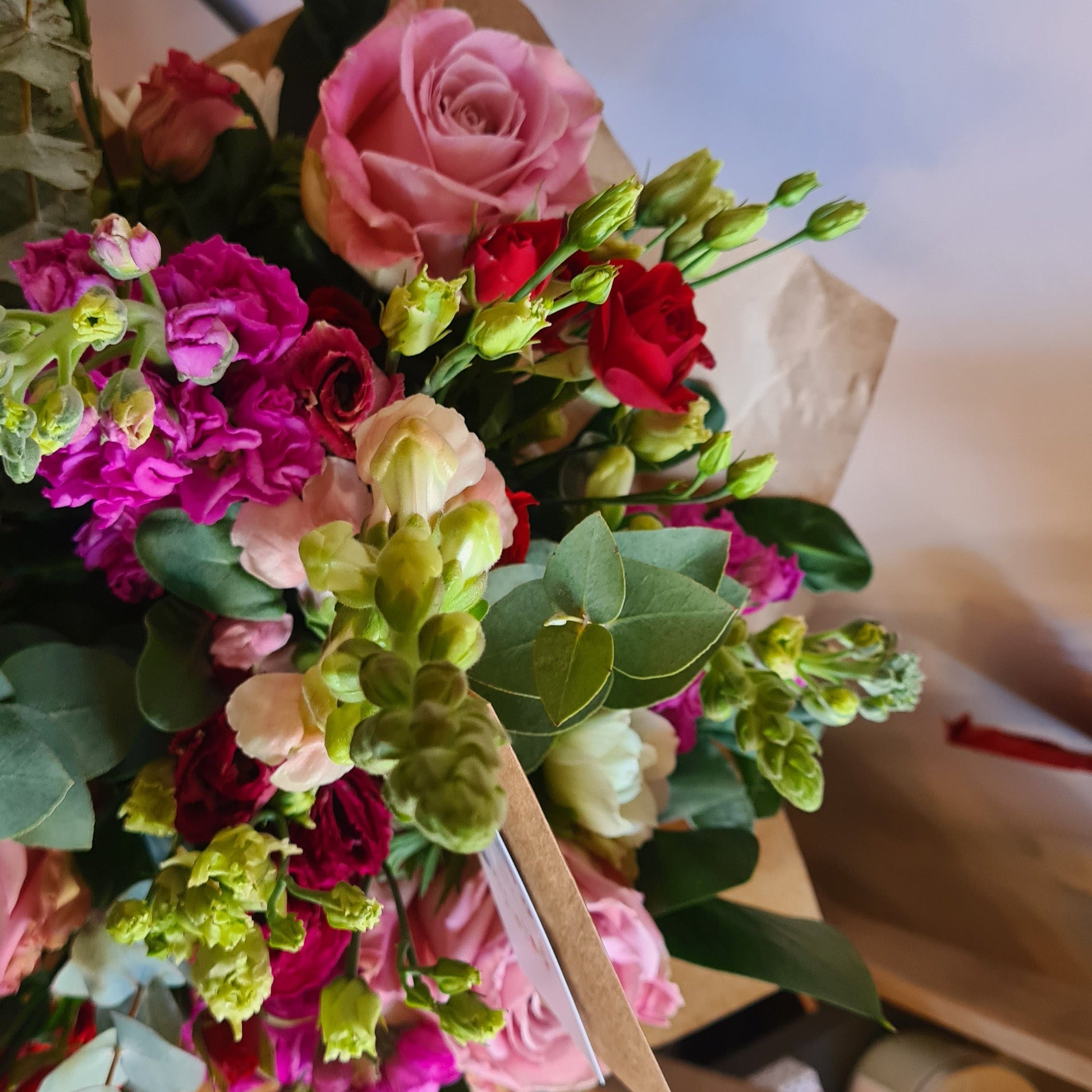 A florist choice mix of our favourite Valentines Day blooms in beautiful red, pink and white tones, combined with fresh foliage. All bouquets are wrapped in our signature brown paper, aqua pack and brown bag.