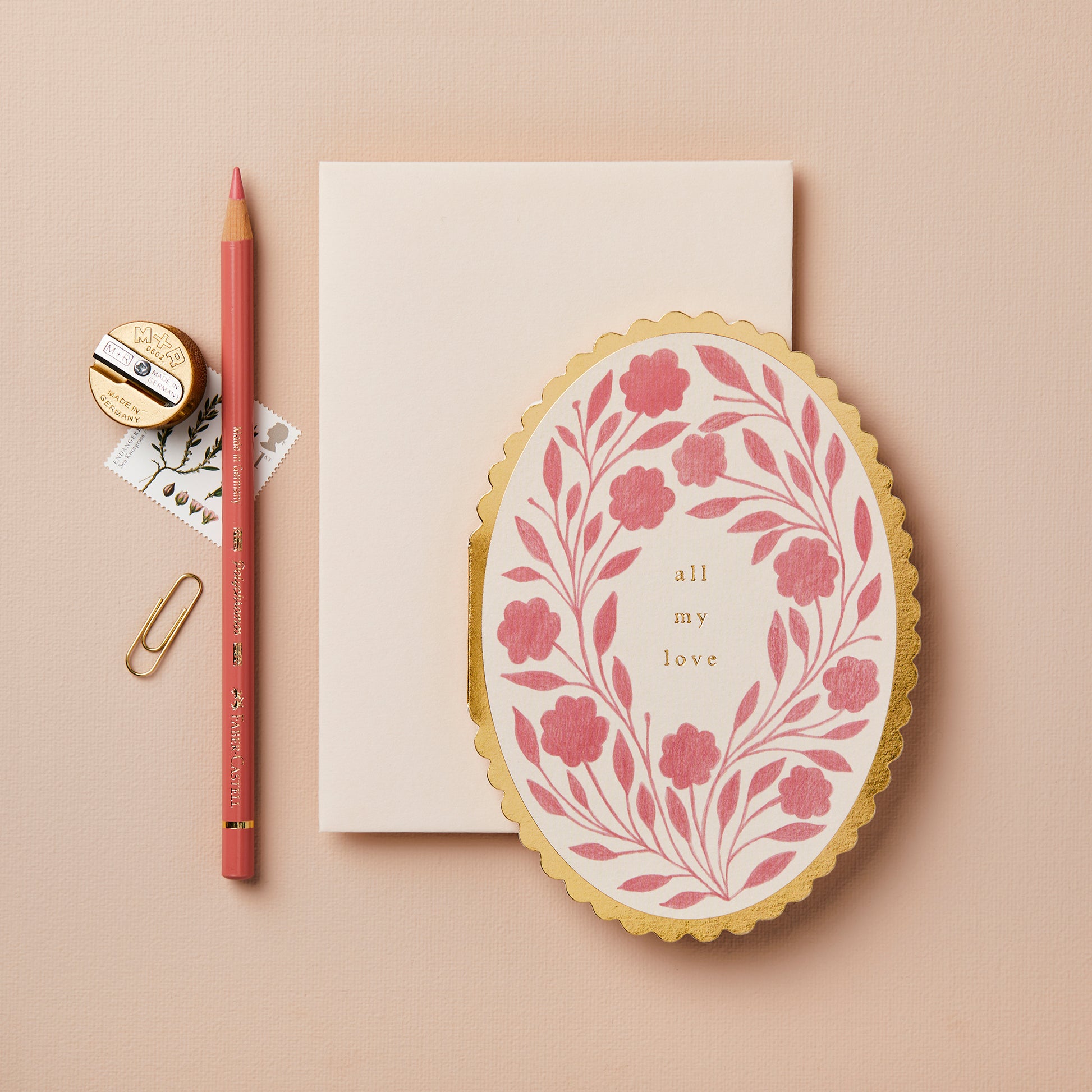 A beautiful oval card with golden scallop edging and a rose pink floral print. The floral design has a painterly quality as it's taken from an original gouache painting, and the gold foil text in the centre of the card reads 'all my love'. Paired with a complementary blush pink envelope.