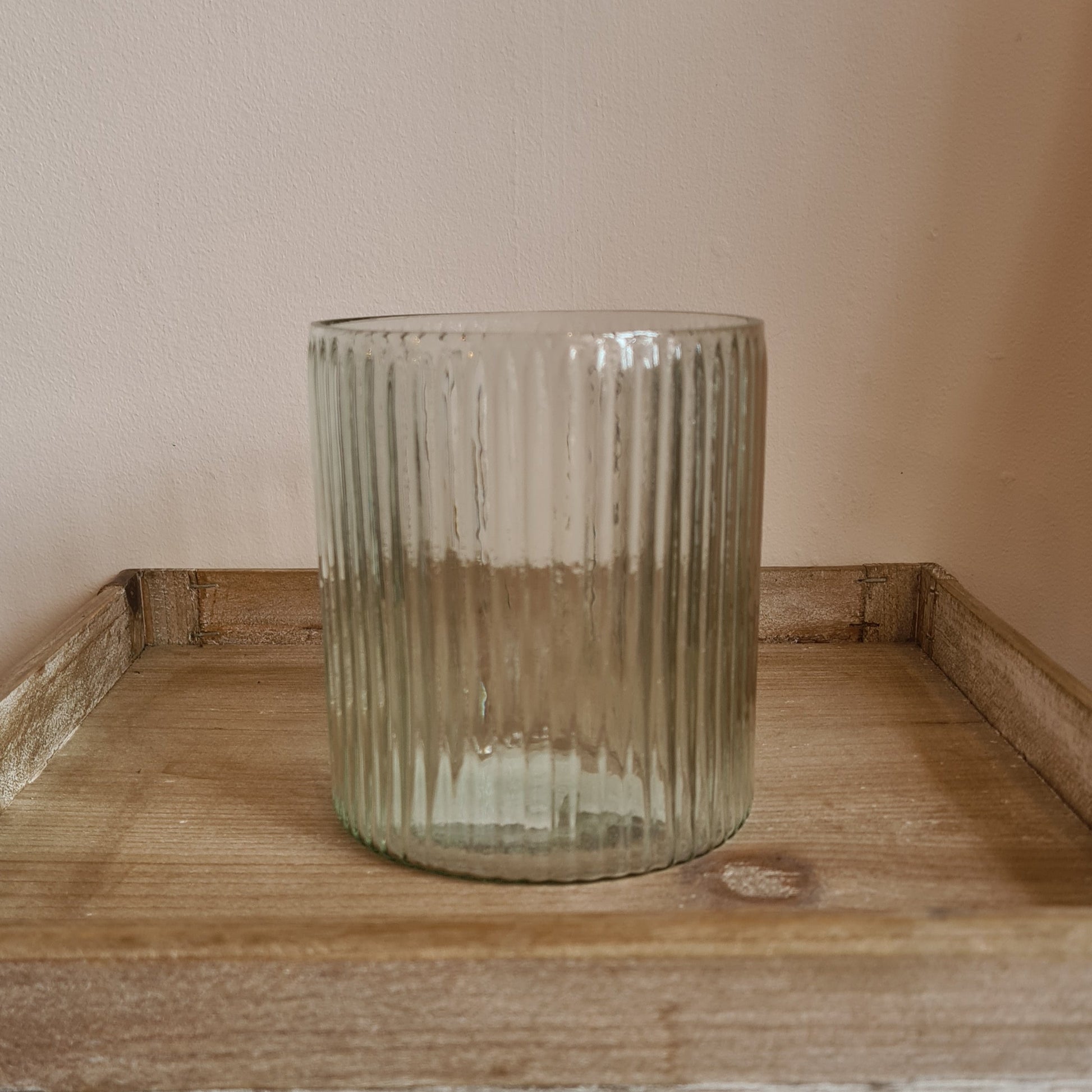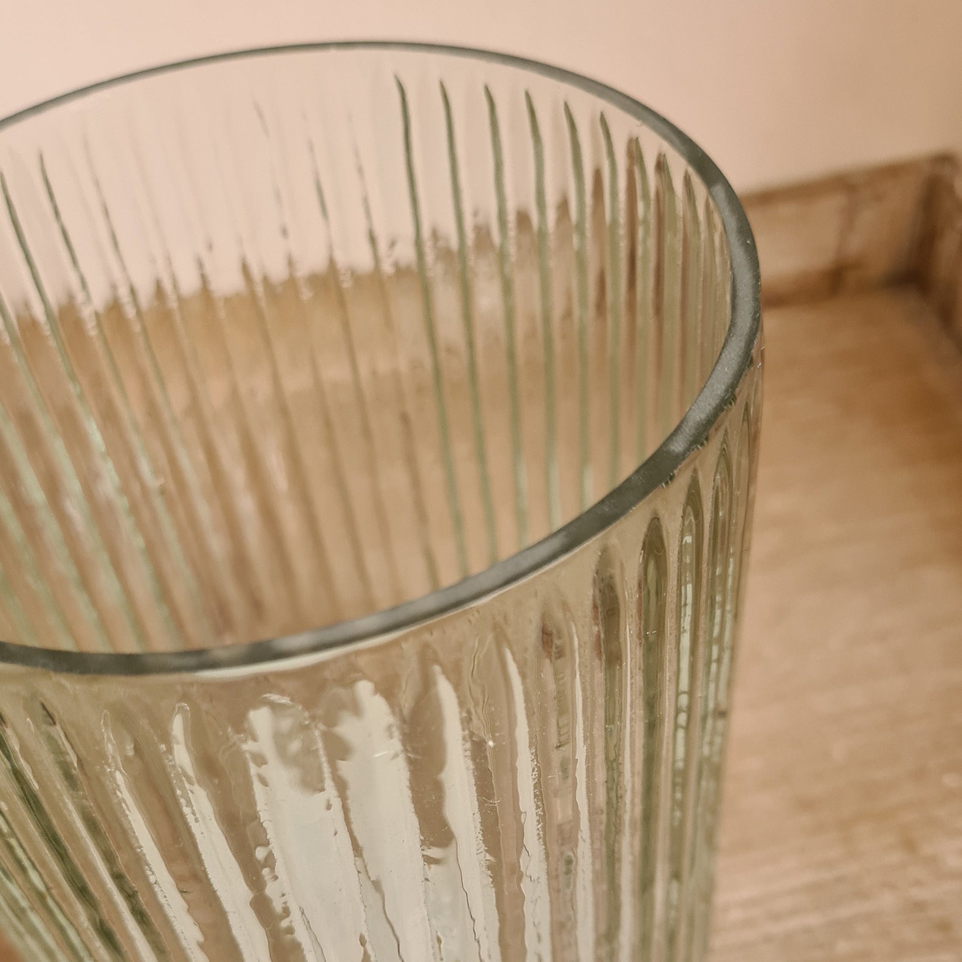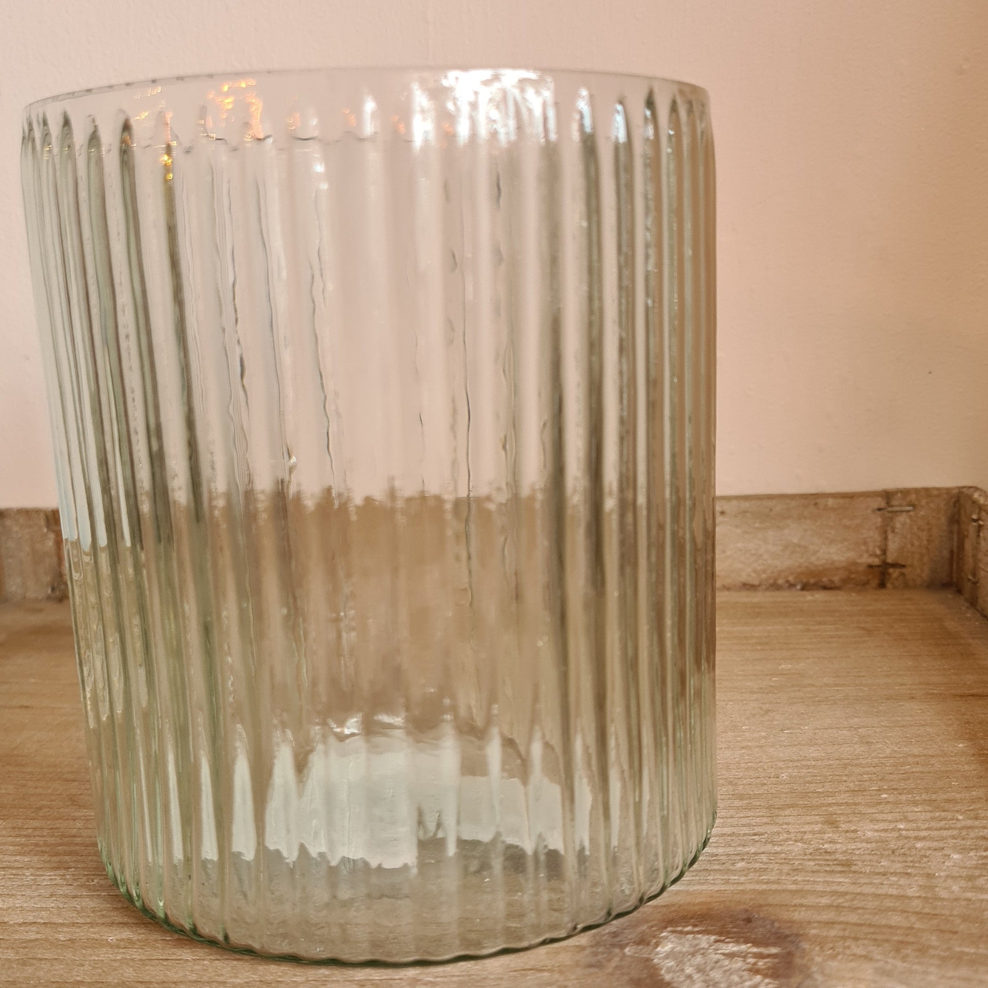 Wide hand made straight ribbed glass vase. The perfect choice to display all your favorite blooms in!